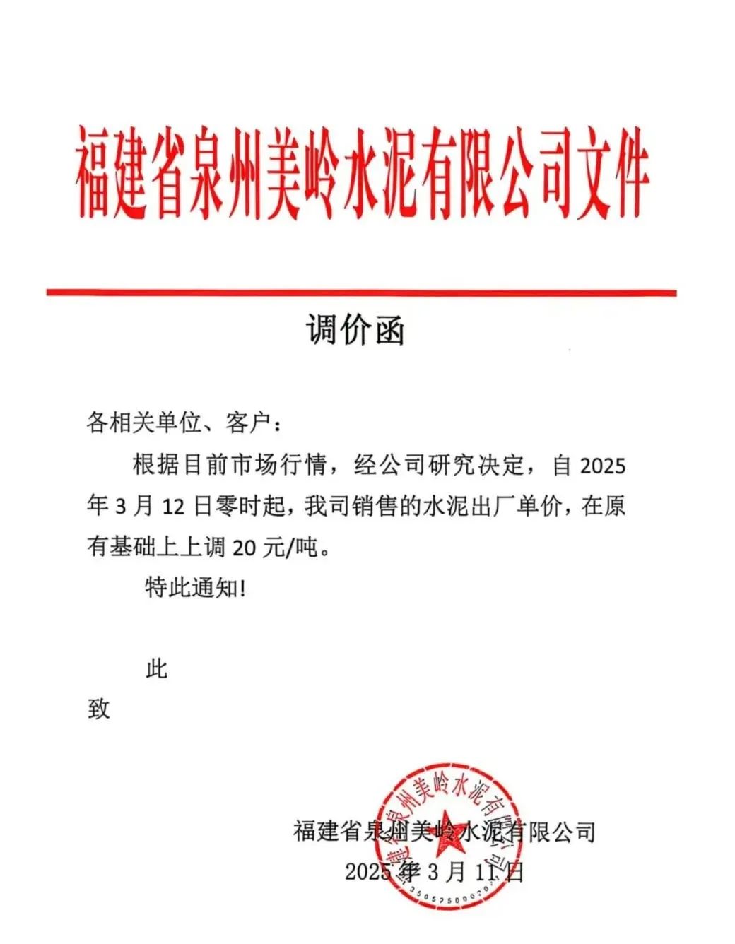 泉州美嶺水泥通知,根據(jù)目前市場(chǎng)行情,經(jīng)公司研究決定,自2025年3月12日零時(shí)起,水泥出廠價(jià)在原有基礎(chǔ)上上調(diào)20元/噸。