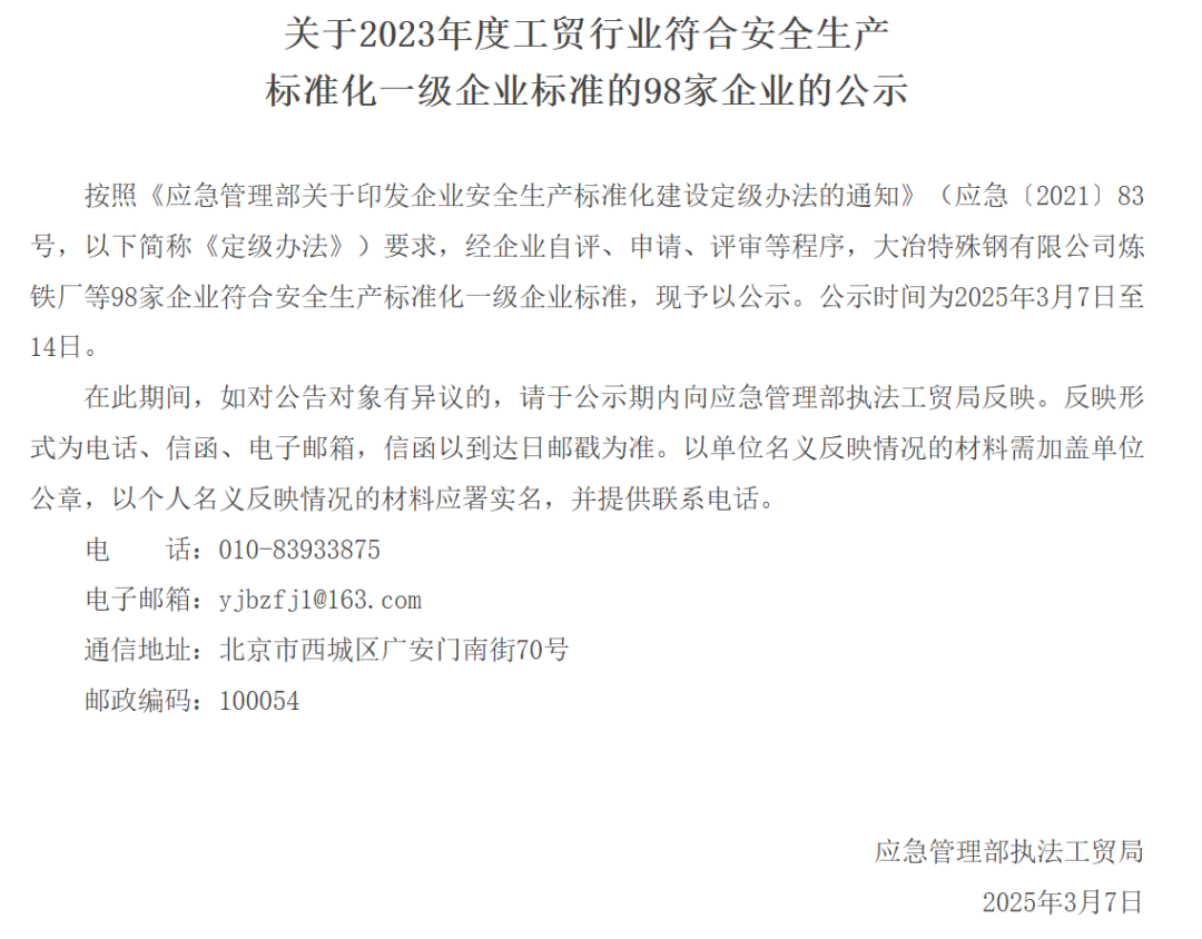 日前,應(yīng)急管理部發(fā)布關(guān)于2023年度工貿(mào)行業(yè)符合安全生產(chǎn)標(biāo)準(zhǔn)化一級(jí)企業(yè)標(biāo)準(zhǔn)的98家企業(yè)的公示稱(chēng),按照《應(yīng)急管理部關(guān)于印發(fā)企業(yè)安全生產(chǎn)標(biāo)準(zhǔn)化建設(shè)定級(jí)辦法的通知》(應(yīng)急〔2021〕83號(hào),以下簡(jiǎn)稱(chēng)《定級(jí)辦法》)要求,經(jīng)企業(yè)自評(píng)、申請(qǐng)、評(píng)審等程序,大冶特殊鋼有限公司煉鐵廠等98家企業(yè)符合安全生產(chǎn)標(biāo)準(zhǔn)化一級(jí)企業(yè)標(biāo)準(zhǔn),現(xiàn)予以公示。公示時(shí)間為2025年3月7日至14日。