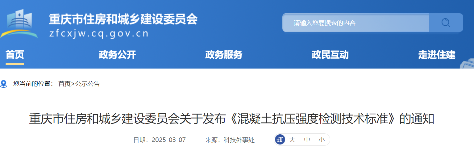 日前,重慶市住房和城鄉(xiāng)建設(shè)委員會關(guān)于發(fā)布《混凝土抗壓強度檢測技術(shù)標(biāo)準(zhǔn)》的通知稱,已批準(zhǔn)《混凝土抗壓強度檢測技術(shù)標(biāo)準(zhǔn)》為重慶市工程建設(shè)地方標(biāo)準(zhǔn),編號為DBJ50/T-195-2025,自2025年6月1日起施行,原《回彈法檢測混凝土抗壓強度技術(shù)規(guī)程》DBJ50-057-2006、《高強混凝土抗壓強度檢測技術(shù)規(guī)程》DBJ50/T-195-2014同時廢止。標(biāo)準(zhǔn)文本可在標(biāo)準(zhǔn)備案后登錄重慶市住房和城鄉(xiāng)建設(shè)技術(shù)發(fā)展中心官網(wǎng)免費下載。本標(biāo)準(zhǔn)由重慶市住房和城鄉(xiāng)建設(shè)委員會負(fù)責(zé)管理,重慶市建筑科學(xué)研究院有限公司負(fù)責(zé)具體技術(shù)內(nèi)容解釋。
