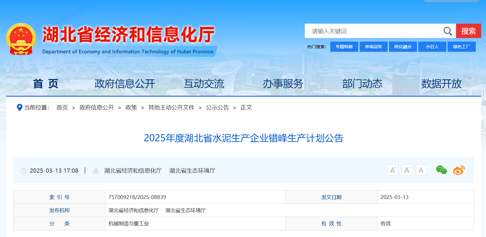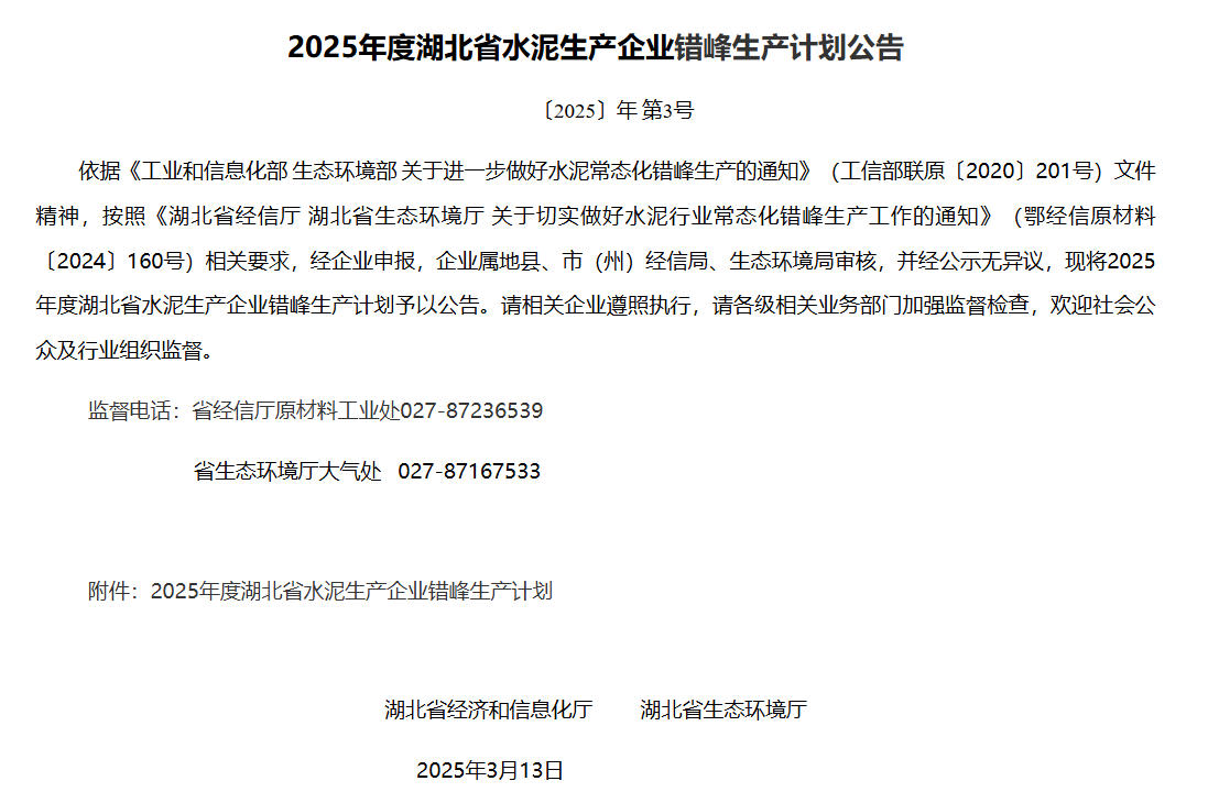 同日,湖北省經(jīng)信廳發(fā)布《2025年度湖北省水泥生產(chǎn)企業(yè)錯峰生產(chǎn)計劃公告》稱,依據(jù)《工業(yè)和信息化部生態(tài)環(huán)境部關(guān)于進一步做好水泥常態(tài)化錯峰生產(chǎn)的通知》(工信部聯(lián)原〔2020〕201號)文件精神,按照《湖北省經(jīng)信廳湖北省生態(tài)環(huán)境廳關(guān)于切實做好水泥行業(yè)常態(tài)化錯峰生產(chǎn)工作的通知》(鄂經(jīng)信原材料〔2024〕160號)相關(guān)要求,經(jīng)企業(yè)申報,企業(yè)屬地縣、市(州)經(jīng)信局、生態(tài)環(huán)境局審核,并經(jīng)公示無異議,現(xiàn)將2025年度湖北省水泥生產(chǎn)企業(yè)錯峰生產(chǎn)計劃予以公告。請相關(guān)企業(yè)遵照執(zhí)行,請各級相關(guān)業(yè)務(wù)部門加強監(jiān)督檢查,歡迎社會公眾及行業(yè)組織監(jiān)督。