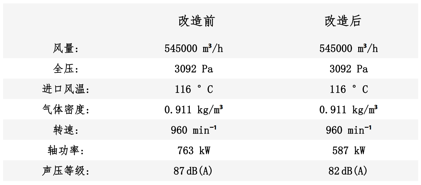 在項(xiàng)目低投入下,客戶成功完成了風(fēng)機(jī)的改造升級,能耗大幅降低23%,噪音降低5.8%,實(shí)現(xiàn)了低成本,高效益的既定改造目標(biāo)。風(fēng)機(jī)改造前后的參數(shù)如下: