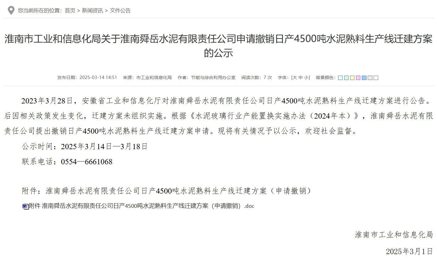 日前,安徽淮南市工業(yè)和信息化局發(fā)布《關(guān)于淮南舜岳水泥有限責(zé)任公司申請(qǐng)撤銷日產(chǎn)4500噸水泥熟料生產(chǎn)線遷建方案的公示》稱,2023年3月28日,安徽省工業(yè)和信息化廳對(duì)淮南舜岳水泥有限責(zé)任公司日產(chǎn)4500噸水泥熟料生產(chǎn)線遷建方案進(jìn)行公告。后因相關(guān)政策發(fā)生變化,遷建方案未組織實(shí)施。根據(jù)《水泥玻璃行業(yè)產(chǎn)能置換實(shí)施辦法(2024年本)》,淮南舜岳水泥有限責(zé)任公司提出撤銷日產(chǎn)4500噸水泥熟料生產(chǎn)線遷建方案申請(qǐng)?,F(xiàn)將有關(guān)情況予以公示,歡迎社會(huì)監(jiān)督。公示時(shí)間:2025年3月14日—3月18日聯(lián)系電話:0554—6661068.