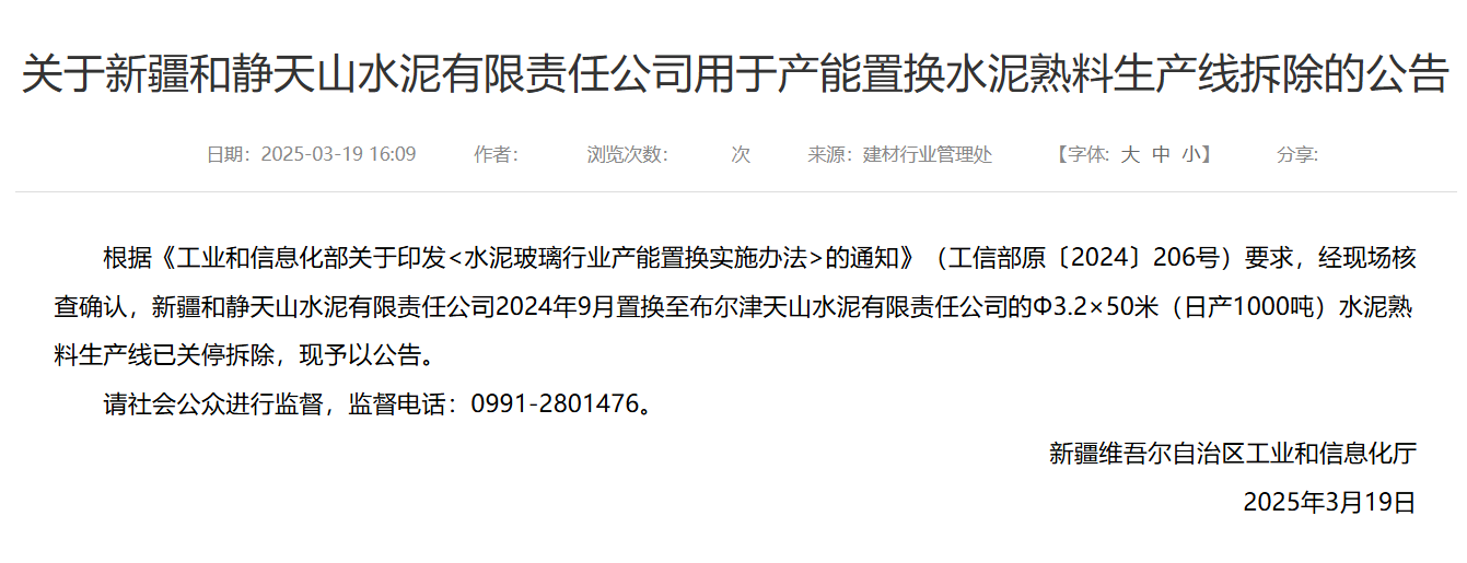 3月19日,新疆維吾爾自治區(qū)工業(yè)和信息化廳發(fā)布《關于新疆和靜天山水泥有限責任公司用于產能置換水泥熟料生產線拆除的公告》稱,根據(jù)《工業(yè)和信息化部關于印發(fā)<水泥玻璃行業(yè)產能置換實施辦法>的通知》(工信部原〔2024〕206號)要求,經(jīng)現(xiàn)場核查確認,新疆和靜天山水泥有限責任公司2024年9月置換至布爾津天山水泥有限責任公司的Φ3.2×50米(日產1000噸)水泥熟料生產線已關停拆除,現(xiàn)予以公告。