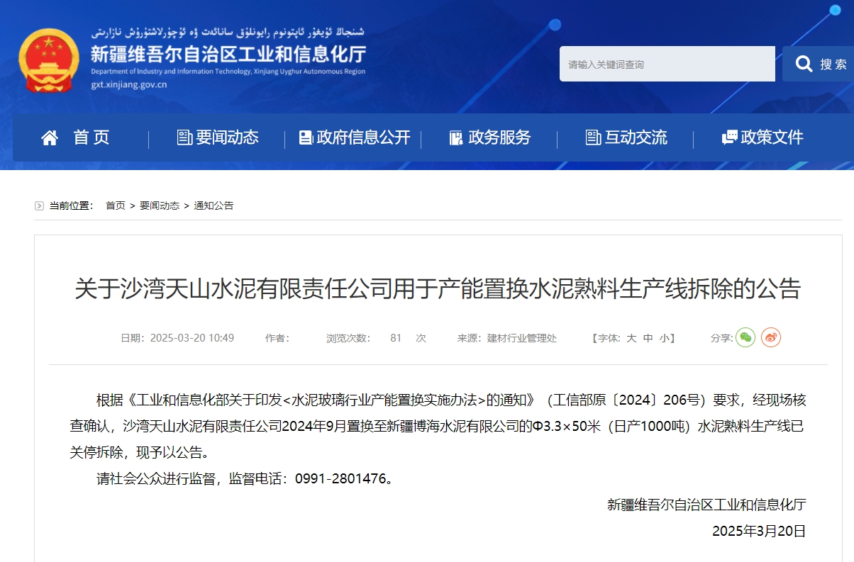 根據(jù)《工業(yè)和信息化部關(guān)于印發(fā)<水泥玻璃行業(yè)產(chǎn)能置換實施辦法>的通知》(工信部原〔2024〕206號)要求,經(jīng)現(xiàn)場核查確認(rèn),沙灣天山水泥有限責(zé)任公司2024年9月置換至新疆博海水泥有限公司的Φ3.3×50米(日產(chǎn)1000噸)水泥熟料生產(chǎn)線已關(guān)停拆除,現(xiàn)予以公告。