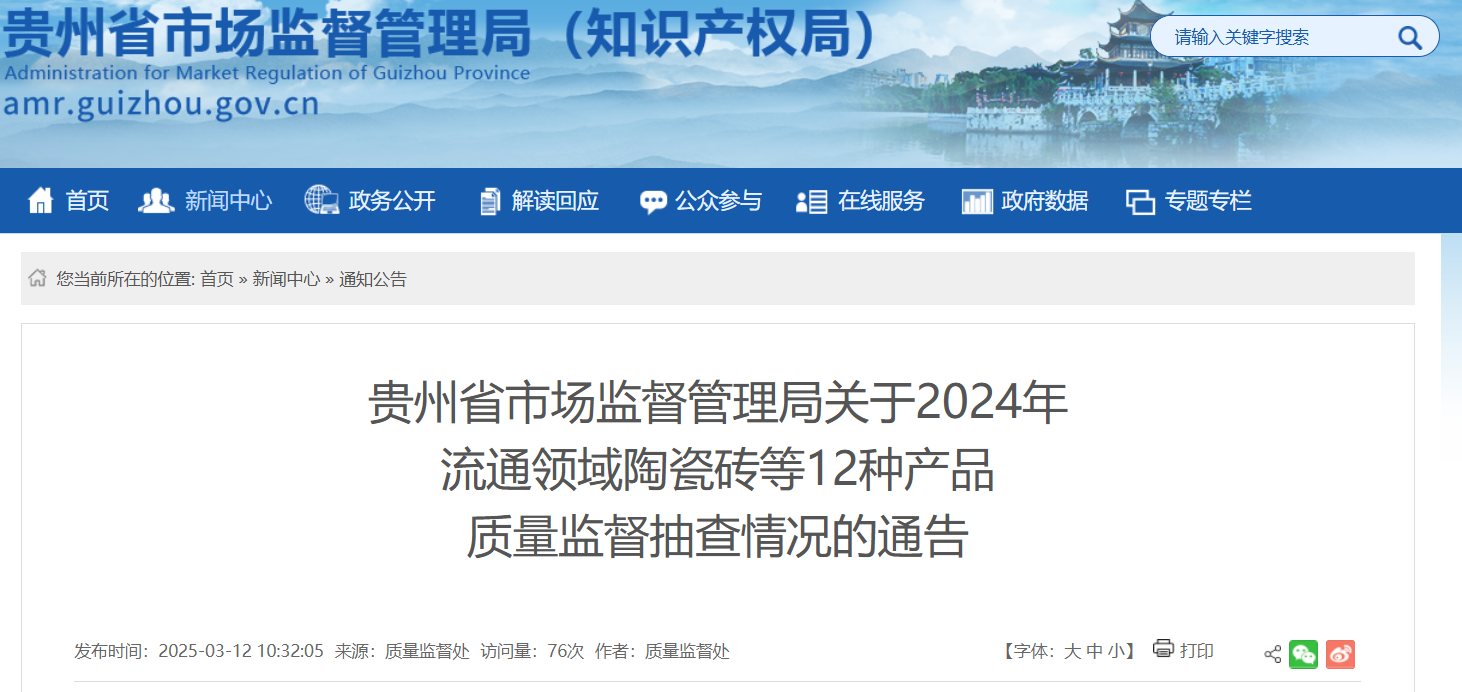 日前,貴州省市場(chǎng)監(jiān)督管理局發(fā)布《關(guān)于2024年流通領(lǐng)域陶瓷磚等12種產(chǎn)品