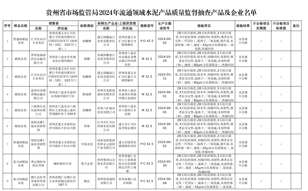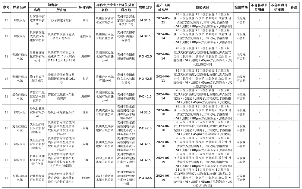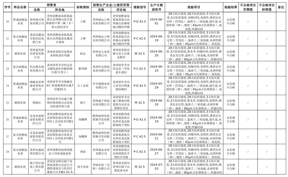 本次共對(duì)26家銷售者銷售的30批次水泥產(chǎn)品開展了監(jiān)督抽查,,抽查區(qū)域?yàn)橘F陽(yáng)市、遵義市、六盤水市、安順市、畢節(jié)市、銅仁市、黔東南州、黔南州、黔西南州。本次監(jiān)督抽查依據(jù)GB 175-2023《通用硅酸鹽水泥》等標(biāo)準(zhǔn)進(jìn)行檢驗(yàn)。經(jīng)檢驗(yàn),未發(fā)現(xiàn)不合格產(chǎn)品。水泥人網(wǎng)注意到上述抽查的30批次水泥全部來自于流通領(lǐng)域。涉及水泥品牌包含海螺、西南、紅獅、潤(rùn)豐、臺(tái)泥、堯柏、上峰、西部等。抽查水泥品種為普通硅酸鹽水泥、復(fù)合硅酸鹽水泥、砌筑水泥三類,其中P.C和P.O水泥抽查標(biāo)號(hào)為42.5.砌筑水泥抽查標(biāo)號(hào)為32.5.