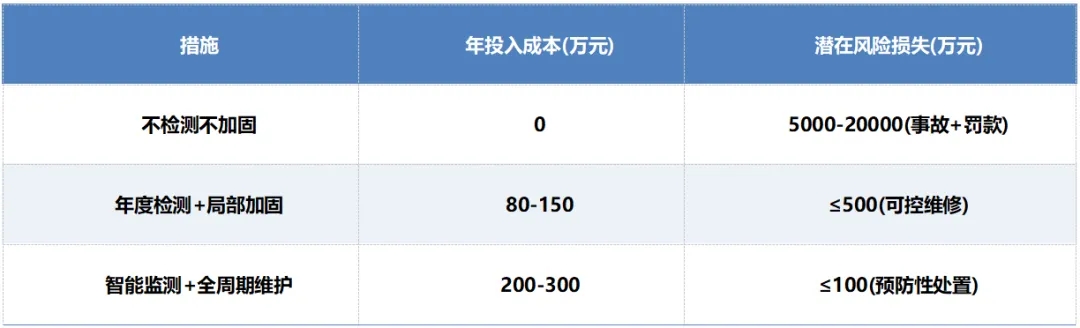 從水泥廠構筑物的結構安全方面綜合考慮,如果水泥不定期進行構筑物的檢測,就會造成一系列安全隱患,嚴重會導致發(fā)生安全事故,進而影響水泥企業(yè)的安全運營,不僅會給水泥廠金錢方面的損失,更會給水泥廠帶來極大的商譽損失。為了減少水泥企業(yè)的損失,匯朗建設為為各大水泥廠算了一筆賬。
