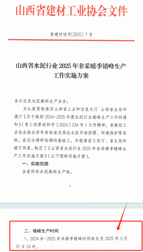 根據(jù)山西省建材工業(yè)協(xié)會(huì)《山西省水泥行業(yè)2025非采暖季錯(cuò)峰生產(chǎn)工作實(shí)施方案》(晉建材字〔2025〕3號(hào)),全省水泥熟料企業(yè)2024年~2025年采暖季錯(cuò)峰時(shí)間延長(zhǎng)至2025年3月31日24時(shí)。
