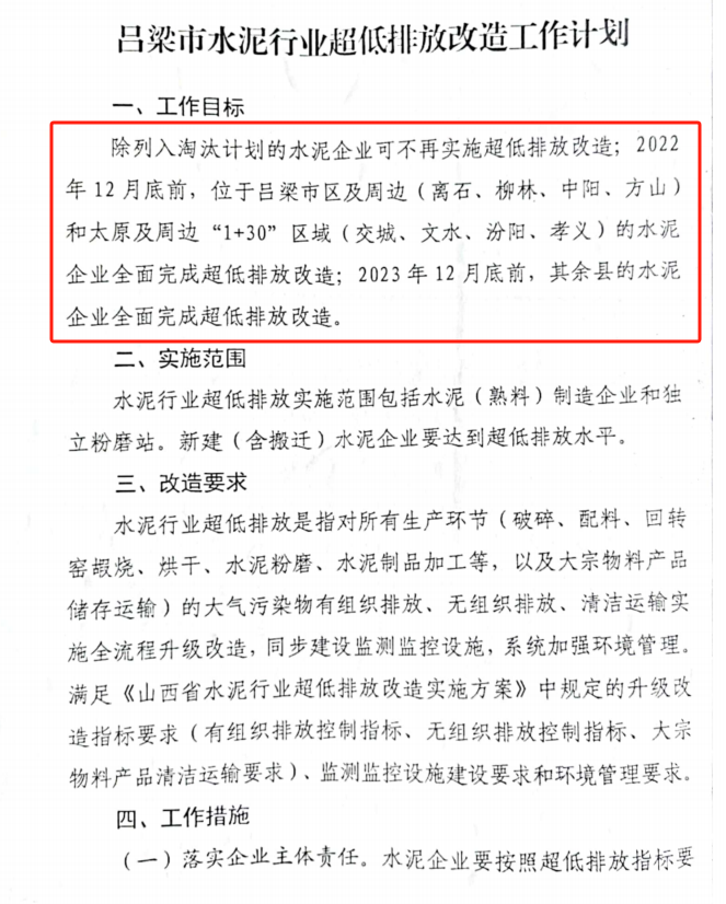 呂梁市生態(tài)環(huán)境局與工信局更早前聯(lián)合印發(fā)的《呂梁市水泥行業(yè)超低排放改造工作計(jì)劃》(呂環(huán)發(fā)〔2021〕121號(hào))明確要求,全市水泥企業(yè)需在2022年12月底前完成超低排放改造并通過驗(yàn)收。2023年山西省政府辦公廳發(fā)布的《加強(qiáng)汾河谷地污染治理若干措施》(晉政辦發(fā)〔2023〕67號(hào))進(jìn)一步將改造時(shí)限放寬至2024年10月。