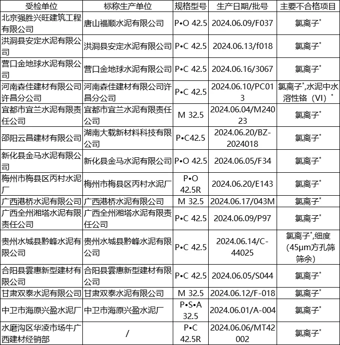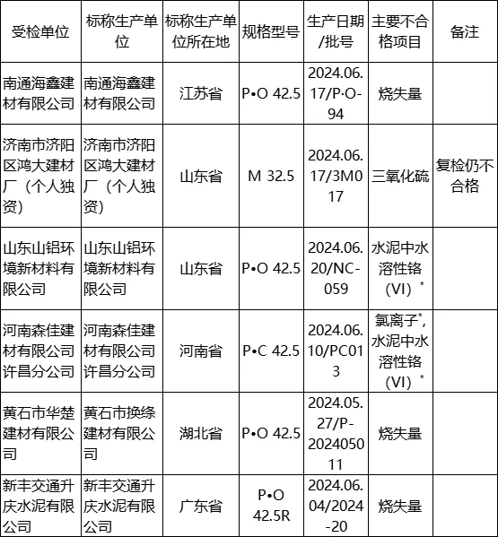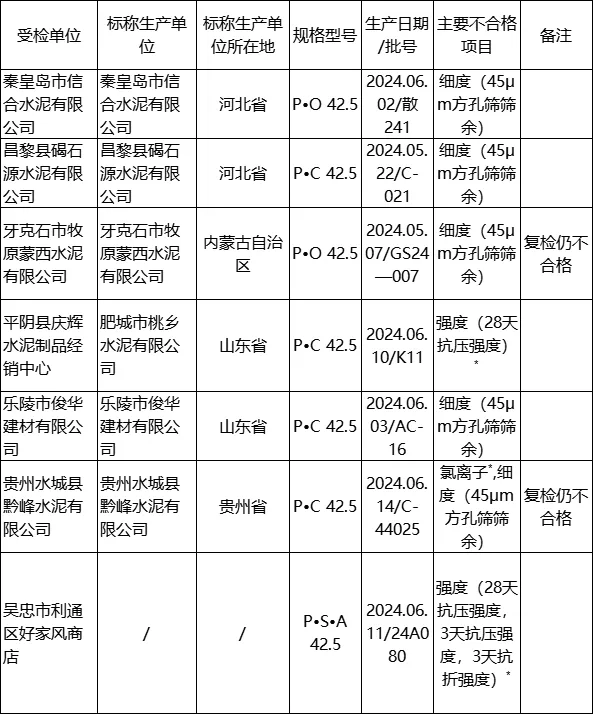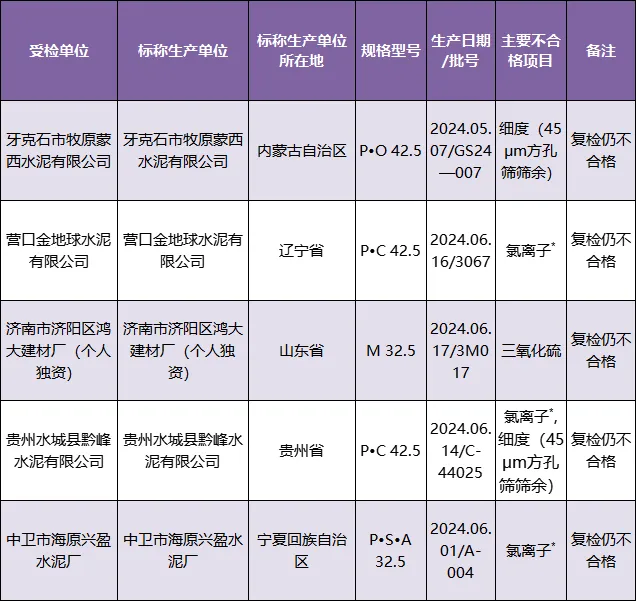 牙克石市牧原蒙西水泥有限公司、營口金地球水泥有限公司、貴州水城縣黔峰水泥有限公司、中衛(wèi)市海原興盈水泥廠、濟南市濟陽區(qū)鴻大建材廠等7個批次復(fù)檢仍不合格。