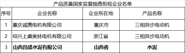 (三)拒檢情況。本次抽查中,重慶誠攜電機有限公司、紹興上虞奧林電機有限公司、山西昌盛水泥有限公司違反《產(chǎn)品質(zhì)量法》規(guī)定,無正當(dāng)理由拒絕接受監(jiān)督抽查。
