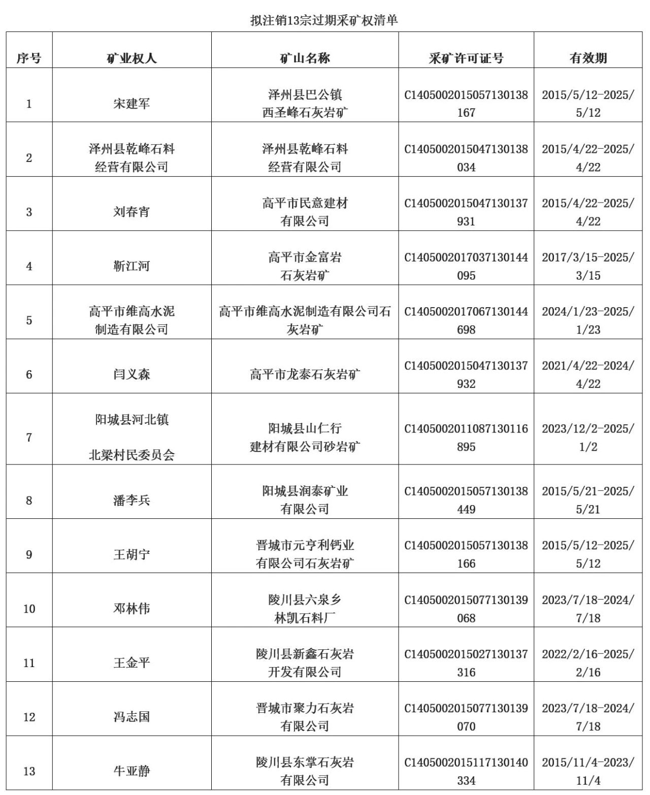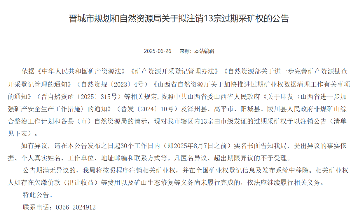 日前,山西晉城市規(guī)劃和自然資源局發(fā)布公告文件稱,依據(jù)相關(guān)文件通知,對市轄區(qū)內(nèi)13宗由市級發(fā)證的過期采礦權(quán)予以注銷公告。